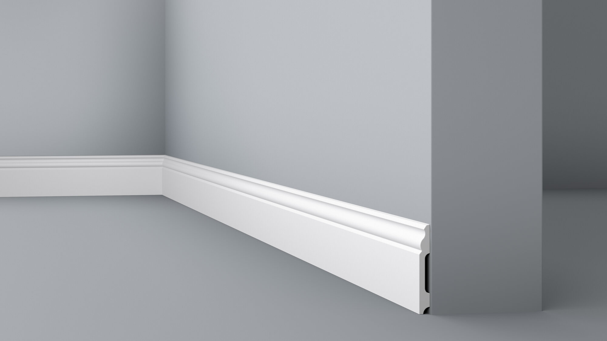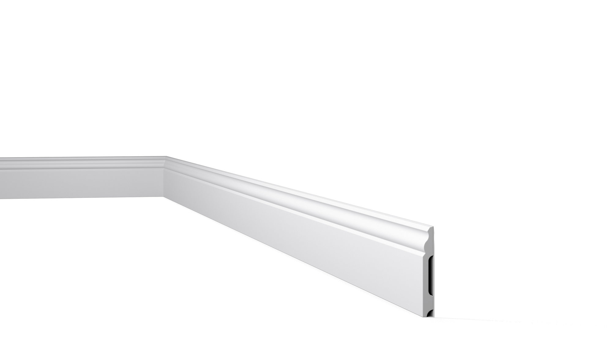 Wysokiej jakości dekoracyjna listwa przypodłogowa pozwalająca w szybki sposób efektownie wykończyć wnętrze na styku ściany i podłogi maskujac nierówności i ukrywając przewody elektryczne. Listwa jest fabrycznie pomalowana kolorem RAL9016 (biały).