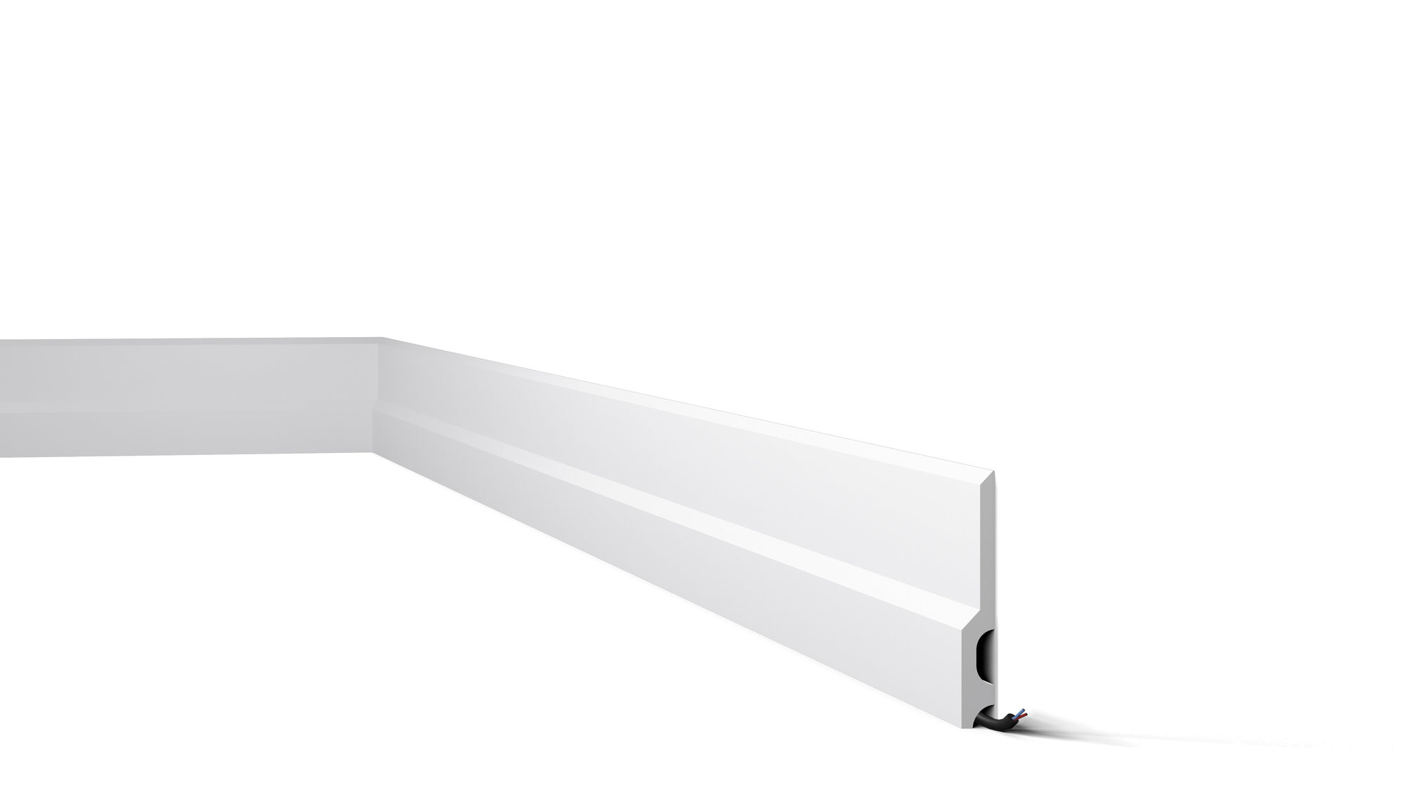 Wysokiej jakości dekoracyjna listwa przypodłogowa pozwalająca w szybki sposób efektownie wykończyć wnętrze na styku ściany i podłogi maskujac nierówności i ukrywając przewody elektryczne.