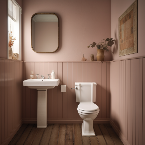 Poniżej inspiracja z lamperią w tym samym kolorze co ściana w łazience w stylu vintage.
