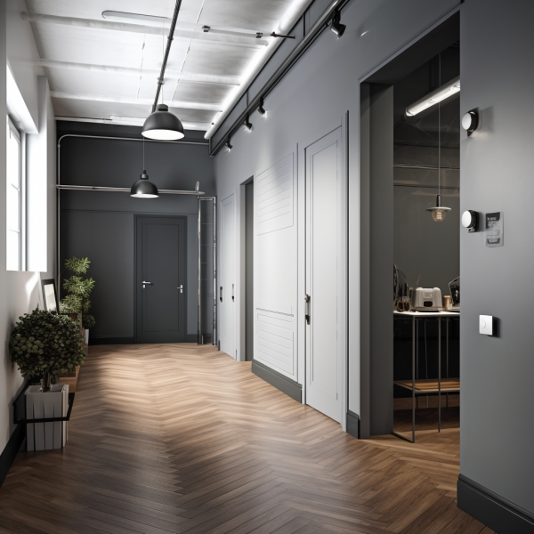 Innym pomysłem będzie pokrycie ściany cienkim akcentem geometrycznym - prostymi listwami ściennymi (np. WL10 WALLSTYL) lub panelami 3D (np. DORIQUE ARSTYL lub CANELE ARSTYL), aby dodać strukturalnego detalu do aranżacji industrialnego wnętrza. Inspiracja poniżej.