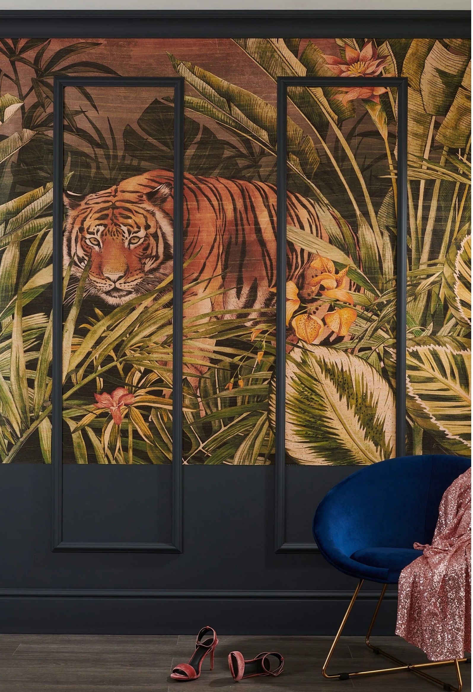 Poniżej inspiracja na zastosowanie listew na całej powierzchni ścian - również wokół futryny drzwi. Dodatkowo fragmenty listew pomalowane zostały na kolor złoty, nadając aranżacji elegancji i szyku.