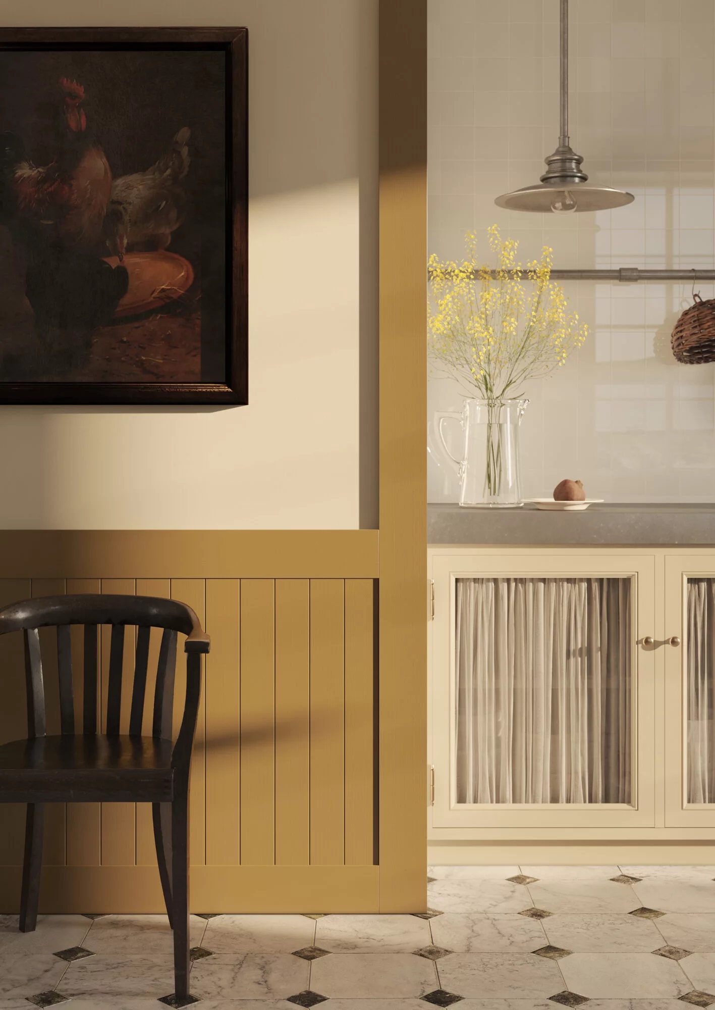 Inny pomysł to stworzenie lamperii z paneli i pomalowanie jej na kontrastujący z resztą pomieszczenia kolor. Takie rozwiązanie będzie pełnić rolę dekoracyjną i praktyczną - listwy będą chronić ściany przed uszkodzeniami. Bardzo dobrze sprawdzi się ten pomysł w jadalni czy przedpokoju, gdzie ściany narażone są na częstsze obicia. Możesz obłożyć jedną ścianę lamperią tworząc efektowne tło dla stołu i krzeseł. Lamperia stworzona z różnych rodzajów listew pomoże dodatkowo wyróżnić tę przestrzeń.